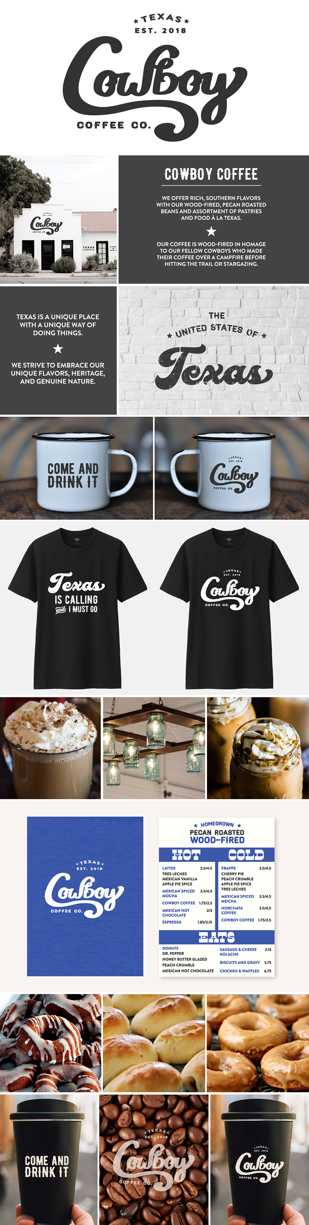 A silly conversation between my boyfriend & I about Texas-themed coffee and donut flavors developed into an idea we had for a Texas-themed coffee shop that our state could call its own. The entrepreneurial spirit in me led to the creation of a brand identity with a hand lettered word mark, package design, print work, & frankensteining all the best Southern flavors into this project.